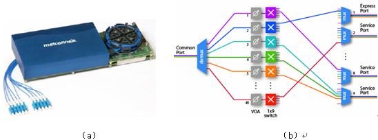 圖9 metconnex 的1 x9 WSS,有十個(gè)端口100GHz 的波長(zhǎng)選擇開關(guān)的產(chǎn)品照片(a)和系統(tǒng)結(jié)構(gòu)(b)。