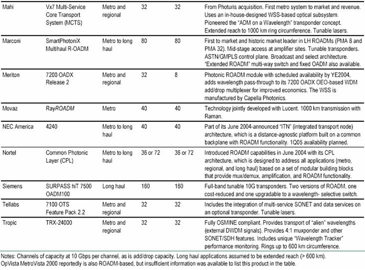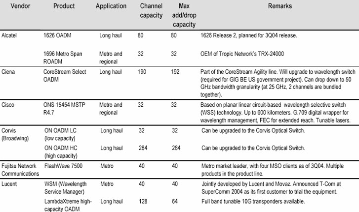 ROADM 的市場(chǎng)可以分為城域,即城市范圍內(nèi),和長(zhǎng)途,特別是延長(zhǎng)距離(>600km)城市之間的應(yīng)用??蛻舻男枨?、和多數(shù)情況下提供的產(chǎn)品可以是大不相同的。城域應(yīng)用又可細(xì)分為基礎(chǔ)設(shè)施 – ROADM由運(yùn)營(yíng)商裝備作為公共網(wǎng)絡(luò)利用,和客戶接入管理服務(wù) – 典型情況是設(shè)備提供的管理服務(wù)賣給專門的客戶。根據(jù) RHK 在2005年的統(tǒng)計(jì),主要的 ROADM 產(chǎn)品和供應(yīng)商如表2所列[4]。