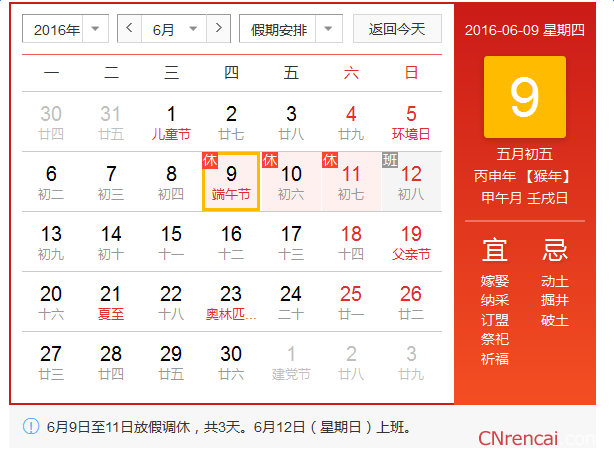 6月9日(星期四,農(nóng)歷端午節(jié)當(dāng)日)為國(guó)家法定節(jié)假日,6月11日(星期六)公休,6月12日(星期日)公休調(diào)至6月10日(星期五),6月12日(星期日)照常上班。
