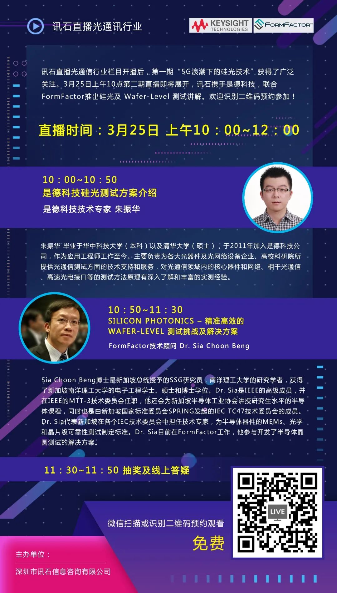 ICCSZ訊 訊石直播光通信行業(yè)欄目開播后,第一期“5G浪潮下的硅光技術(shù)”獲得了廣泛關(guān)注。3月25日上午10點第二期直播即將展開,訊石攜手是德科技,聯(lián)合FormFactor推出硅光及Wafer-Level測試講解。本次直播榮幸邀請到了是德科技測試專家朱振華聯(lián)合FormFactor技術(shù)顧問Sia Choon Beng博士直播關(guān)于硅光測試發(fā)展概況和精準高效的Wafer-Level測試挑戰(zhàn)及解決方案。歡迎識別二維碼預約參加!