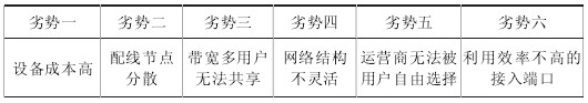 在上世紀(jì)九十年代中期提出 PON 技術(shù),是基于以下兩個(gè)因素而提出來(lái)的:第一,當(dāng)時(shí)光纖每芯每米高達(dá)幾十元左右,價(jià)格及其昂貴,而 PON 所具有的一點(diǎn)對(duì)多點(diǎn)的技術(shù)優(yōu)勢(shì)能把光纖有效節(jié)約下來(lái),尤其是在無(wú)源光分配器無(wú)限接近用戶時(shí),所節(jié)省的光纖更多;第二,因PON 屬于無(wú)源網(wǎng)絡(luò),不管是維護(hù),還是管理,都極其方便。但在今天,隨著生產(chǎn)技術(shù)水平的快速提高,致使光纖的生產(chǎn)成本大幅度降低,現(xiàn)在其市場(chǎng)價(jià)格已比銅質(zhì)電纜來(lái)得低,故使原本 PON 能把光纜節(jié)約的優(yōu)勢(shì)已不復(fù)存在;;此外,當(dāng)前我國(guó)發(fā)展 FTTH,其最為主要目標(biāo)市場(chǎng)應(yīng)該是各個(gè)城市(包括大、中、小城市)住宅小區(qū)中的那些住戶,在我國(guó)各城市的住宅小區(qū),通常設(shè)計(jì)為花園式住宅小區(qū),其最大特色就是:第一,住戶高度集中在一起;第二,為使電信運(yùn)營(yíng)商的寬帶接入設(shè)備便于安裝,在各住宅小區(qū)中都配置著通信機(jī)房;由此可見(jiàn),我國(guó)住宅小區(qū)的這些具體情況就無(wú)法讓 PON 所具有的無(wú)源網(wǎng)絡(luò)這個(gè)優(yōu)勢(shì)得到最充分的體現(xiàn)和發(fā)揮。而 PON 本身所固有的這些不足(具體見(jiàn)下表),恰恰是與我國(guó)現(xiàn)有的實(shí)際情況產(chǎn)生著較大的沖突,無(wú)法與我國(guó)實(shí)際情況保持一致。