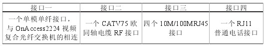把每個(gè)信息點(diǎn)的 OnAccessH1004 光網(wǎng)絡(luò)單元進(jìn)行相連接是基于點(diǎn)對(duì)點(diǎn)這種方式,而向用戶同時(shí)提供接入 CATU 廣播、電話及因特網(wǎng)這三網(wǎng),則以雙工 100M 這種高速速率來(lái)完成;至于 OnAccessH1004這個(gè)網(wǎng)絡(luò)單元可通過(guò)一系列接口來(lái)完成整個(gè)網(wǎng)絡(luò)的運(yùn)行, 這些重要接口如下表所示: