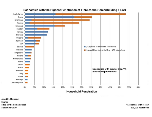 本月在拉斯維加斯舉辦的2010 FTTH研討會暨展覽會上,F(xiàn)TTH Council宣布了最新的FTTH/FTTB滲透率排名,總共24個經(jīng)濟體(FTTH/FTTB家庭滲透率至少超過1%)入圍排名。就G-20國家來看,此次的排名跟去年年底的調(diào)查一樣,有7個G-20國家在名單之內(nèi),包括:南韓、日本、美國、中國、俄羅斯、意大利和法國。南韓保持其全球FTTH/FTTB滲透率領(lǐng)先的地位,截止2010年6月,其滲透率已經(jīng)超過50%。同時,一些東歐經(jīng)濟體,尤其是立陶宛、斯洛文尼亞、愛沙尼亞和保加利亞,這些國家FTTH滲透率正在持續(xù)擴大。