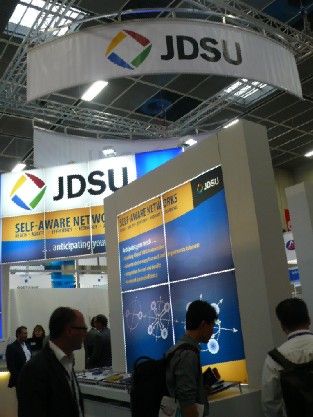 Live 100G Demo – includes a 100G Compact Form Pluggable (CFP) optical interface based on mature 10G technology 和 Enhanced Tunable XFPRaman Amplifier 。以及Comprehensive Transceiver Portfolio – including pluggable solutions for emerging wireless and 40G applications。另外JDSU展示的通信測試設備產品有:Live 40-100G 產品包括有JDSU ONT 100G 測試解決方案,新的 Multimode/Singlemode QUAD Optical Time Domain Reflectometer (OTDR) ,High Resolution Dispersion Test Solution等。