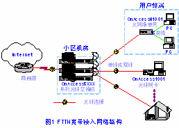 網(wǎng)絡(luò)主要由放置于小區(qū)機(jī)房的光線路終端(Optical Line Terminal—OLT )OnAccess5xxx系列低成本光口交換機(jī)和放置于用戶側(cè)的光網(wǎng)絡(luò)單元(Optical Network Unit—ONU)OnAccessH1001組成。傳輸媒介是單模光纖,可以選擇單纖,也可以選擇雙纖。一臺(tái)OnAccess5xxx 光交換機(jī)可以連接24 個(gè)用戶的OnAccessH1001光網(wǎng)絡(luò)單元,OnAccessH1001可以同時(shí)下聯(lián)多達(dá)4臺(tái)電腦或IP電話。如果用戶只有一臺(tái)電腦可以選擇OnAccess1001光纖網(wǎng)卡內(nèi)插于計(jì)算機(jī),直連接入光纖。接入帶寬為專線雙向100M,傳輸距離達(dá)20km。