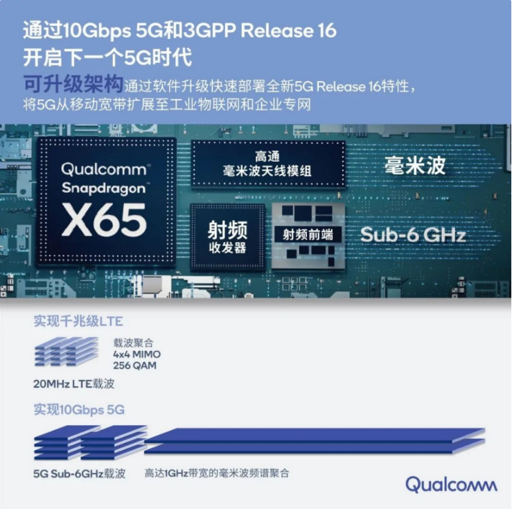 IT之家了解到,今年 2 月份,高通正式發(fā)布了驍龍 X65 5G 調(diào)制解調(diào)器及射頻系統(tǒng)(簡稱“驍龍 X65”)—— 第 4 代 5G 調(diào)制解調(diào)器到天線的解決方案。它是全球首個支持 10Gbps 5G 速率和首個符合 3GPP Release 16 規(guī)范的調(diào)制解調(diào)器及射頻系統(tǒng)。