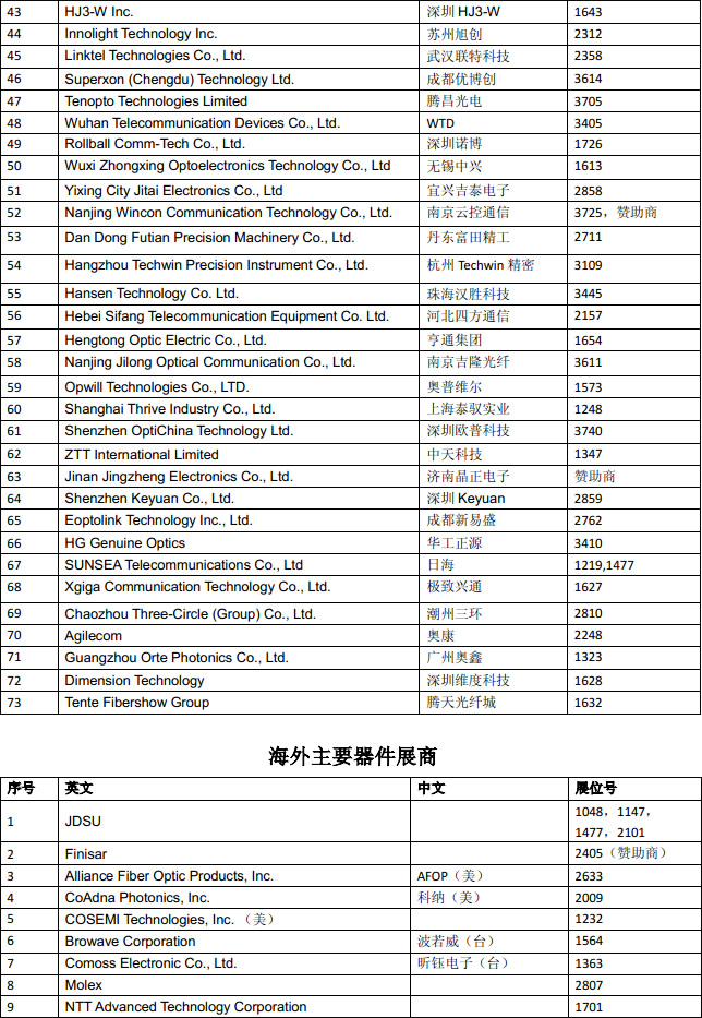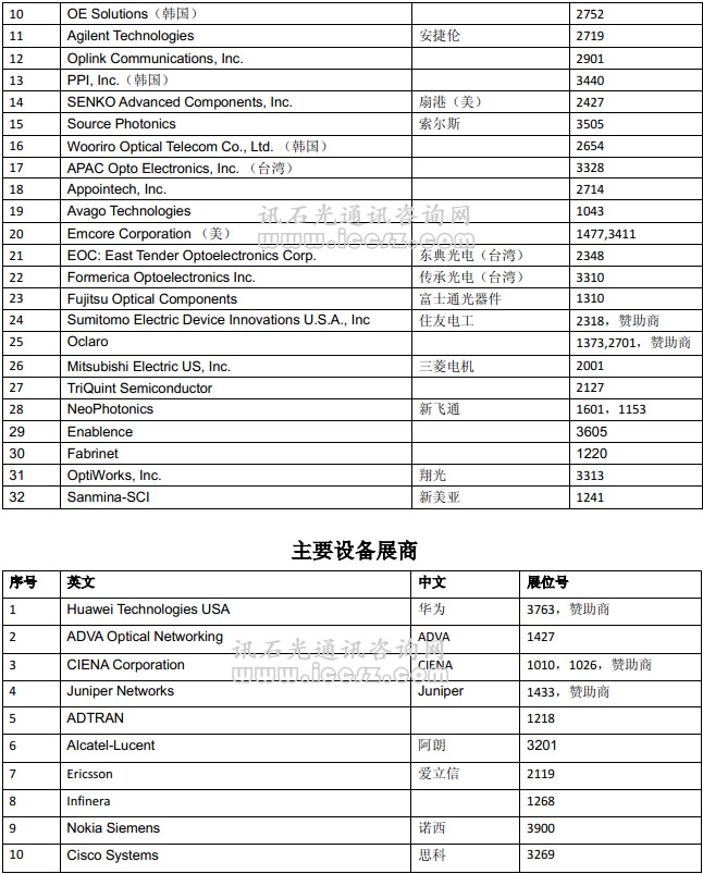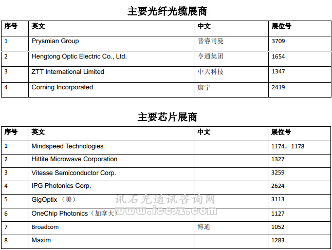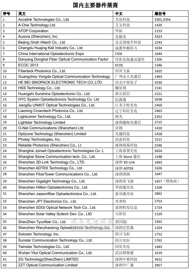 【訊石光通訊咨詢網(wǎng)】OFC 2013即將于下周在美國開幕,據(jù)訊石了解本次國內(nèi)外光通訊展商有五百五余家,其中國內(nèi)企業(yè)有七十多家。訊石特整理主要的參展商名單信息,展商覆蓋從器件商到設(shè)備商,再到光纖光纜和芯片廠商,以供業(yè)界查詢使用。本屆OFC2013熱點(diǎn)將集中在:云計(jì)算和數(shù)據(jù)中心網(wǎng)絡(luò),空分復(fù)用,100G/400G網(wǎng)絡(luò)設(shè)計(jì)和優(yōu)化,1Tb和超光網(wǎng)絡(luò),靈活網(wǎng)格狀網(wǎng)絡(luò),波長敏捷接入網(wǎng)絡(luò),虛擬化和SDN,相干探測,高速光子集成,光和無線網(wǎng)絡(luò)的融合等。