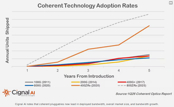 Cignal AI的Wilkinson對(duì)此表示贊同。他表示:“400ZRx是迄今為止應(yīng)用最廣泛的相干技術(shù),而隨著超大規(guī)模數(shù)據(jù)中心部署更高速率以支持?jǐn)?shù)據(jù)中心互聯(lián)和AI,800ZRx有望超越它?!?