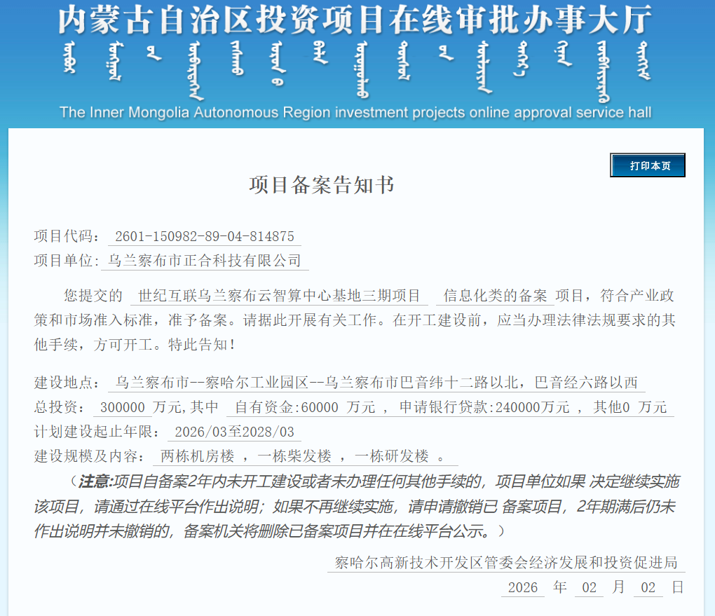ICC訊 2月2日,世紀(jì)互聯(lián)烏蘭察布云智算中心基地三期項(xiàng)目通過察哈爾高新技術(shù)開發(fā)區(qū)管委會經(jīng)濟(jì)發(fā)展和投資促進(jìn)局審批備案。項(xiàng)目總投資30億元,其中自有資金6億元,貸款24億元。