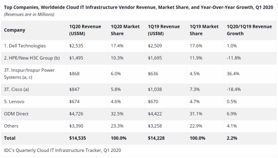 ICC訊(編譯:Nina)根據(jù)IDC的最新數(shù)據(jù),2020年第一季度,設(shè)備商用于云環(huán)境(包括公有云和私有云)的IT基礎(chǔ)設(shè)施(服務(wù)器、企業(yè)存儲和以太網(wǎng)交換機)收入增長了2.2%,同時傳統(tǒng)非云基礎(chǔ)設(shè)施的收入下降了16.3%。