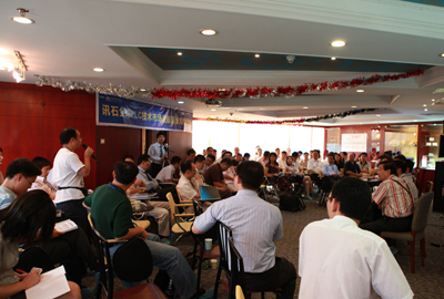 本次論壇的最后一個重頭戲是:討論環(huán)節(jié)。石明董事長作為主持人,與華博士、李總、梁總、朱總、程總、金總等講師們以及劉弘度老師等與各位聽眾面對面地坐著,接受各公司代表們的提問。為節(jié)約時間以及不紊的秩序,我們選取了多家公司一一提問的方式。提問者也充分把握這次難得的機會,向臺上的各位“頂尖”人物提出自己心中的疑問。各位老總們也熱情地回答了提問者的每個問題。