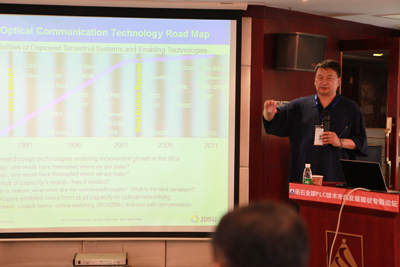 接下來,JDSU的PLC負責人華一敏博士與大家分享《全球PLC技術(shù)發(fā)展趨勢》。從PLC、PIC、波導技術(shù)、40G&100G解決方案,深入淺出、思路清晰,贏得了大部分參會者的認同。下一個演講者也令大家十分期待,他就是光迅科技副總經(jīng)金正旺先生。他的演講題目也挑起了大家的濃厚興趣:《PLCS市場競爭與贏利模式》。他一上臺便先感謝大家對光迅上市的關(guān)注與祝福。之后,金總從FTTH市場、PLCS市場的商業(yè)模式、競爭模式、市場整合、競爭優(yōu)勢分析、市場趨勢等方面對PLCS市場競爭與贏利模式進行了詳細而獨到的解說。