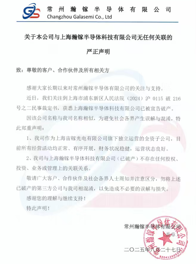 根據(jù)上海市浦東新區(qū)人名法院(2024)滬0115破216號(hào)之二民事裁定書(shū),“上海瀚鎵半導(dǎo)體有限公司”已被宣告破產(chǎn)。因該公司與常州瀚鎵名稱(chēng)相似,為避免社會(huì)各界產(chǎn)生誤解與混淆,特此鄭重發(fā)布本篇嚴(yán)正聲明。