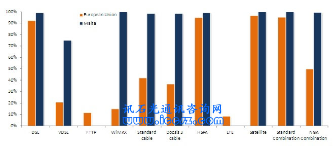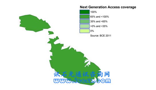 《2011歐洲寬帶覆蓋》調(diào)研報告顯示,馬耳他的基本寬帶(至少提供144kbps的服務,只要他們愿意)覆蓋達到100%,超高速寬帶(也稱為NGA,即下一代接入)覆蓋超過99%。在調(diào)研的29個國家中(歐盟27國和挪威、冰島),96%能夠獲得基本寬帶,超過50%(一半國家走向2020數(shù)字天堂目標)能夠獲得超高速。