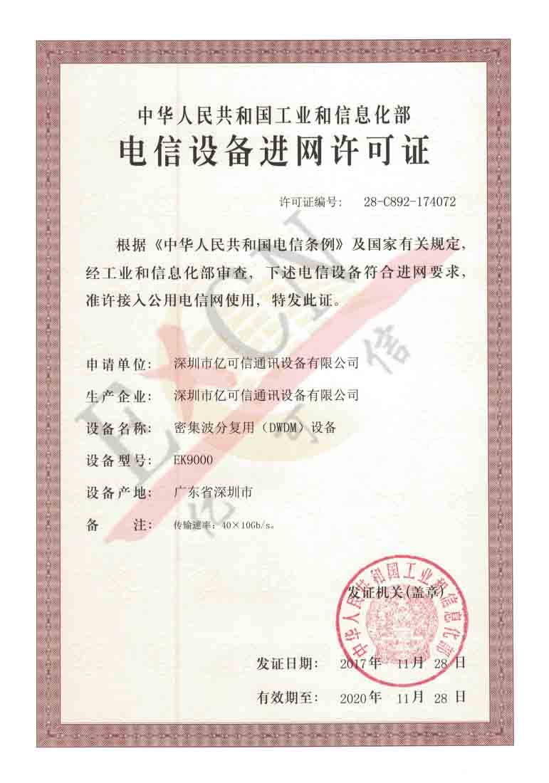 億可信產(chǎn)品廣泛應(yīng)用于中國(guó)移動(dòng)、中國(guó)電信、中國(guó)聯(lián)通、國(guó)家廣電、國(guó)家電力等大型重點(diǎn)工程及網(wǎng)絡(luò)運(yùn)營(yíng)商,2017年公司生產(chǎn)的密集波分復(fù)用(DWDM)設(shè)備獲得了國(guó)家工信部頒發(fā)的電信設(shè)備進(jìn)許可證!