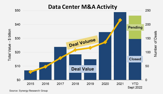 ICC訊(編譯:Nina)Synergy Research的最新數(shù)據(jù)顯示,今年前9個(gè)月,140宗以數(shù)據(jù)中心為導(dǎo)向的并購(gòu)交易完成,總價(jià)值為300億美元,而另有170億美元的未決交易已達(dá)成協(xié)議,但尚未正式完成,其中大部分預(yù)計(jì)將在年底前完成。在加上幾乎沒(méi)有事先公開(kāi)通知的常規(guī)交易之后,2022年的并購(gòu)活動(dòng)可能最終與去年的創(chuàng)紀(jì)錄水平持平。據(jù)Synergy記錄,2021年完成的交易總共有216筆,總價(jià)值超過(guò)490億美元,比2020年的340億美元增長(zhǎng)了42%(2020年本身就是創(chuàng)紀(jì)錄的一年)。