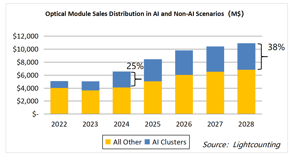 隨著AI集群應用的迅速崛起,數(shù)據(jù)中心對高速光模塊速率的需求日益迫切,根據(jù)LightCounting預測,AI集群的應用從2024年開始快速增加,預計到2028年,AI集群的光模塊需求會占據(jù)整個光模塊市場38%,而在高速光模塊的發(fā)貨占比中,1.6T光模塊預計會在2027年開始商用,并開始逐步上量。