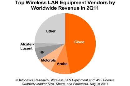 Cisco和Aruba位居無線局域網(wǎng)設(shè)備收入(排除WIFI手機(jī))的前兩名,Motorola超HP居第三。
