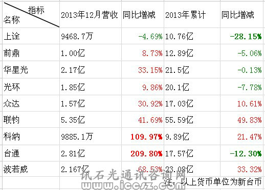 ICCSZ訊(編輯:Debi)2013年已經(jīng)過去,近日,臺灣光通訊廠商紛紛公布2013年12月營收以及2013年全年營收情況,訊石小編進(jìn)行了綜合整理,并進(jìn)行簡要分析變動原因。2013年12月,臺灣光通訊廠商普遍實(shí)現(xiàn)營收增長,僅上詮12月營收9468.7萬,同比下降4.69%,其他廠商12月營收均實(shí)現(xiàn)增長,幅度大小不一。