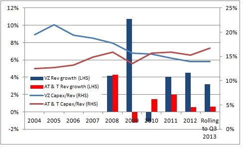 此外,這兩家公司已經(jīng)給出低迷的資本開支預(yù)測(cè)。AT&T管理層表示,“我們估計(jì)2013年資本開支在210億美元左右,2014年和2015年將在200億美元左右。”這幾個(gè)數(shù)字都低于AT&T 2012年的資本開支水平。同時(shí),Verizon認(rèn)為,“至于資本開支方面,未來(lái)我們將致力于改善資本支出收入比。”