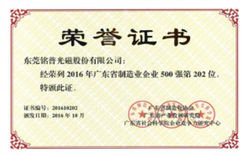 ICCSZ訊 10月13日,由廣東省制造業(yè)協(xié)會、廣東省產(chǎn)業(yè)發(fā)展研究院、廣東省社會科學院共同主辦的2016年廣東省制造業(yè)發(fā)展年會暨廣東省制造業(yè)500強峰會在珠海成功召開,會上發(fā)布了“2016年廣東省制造業(yè)企業(yè)500強”名單,東莞銘普光磁股份有限公司(以下簡稱銘普公司)榮列第202位。廣東省人民政府副秘書長鐘凱輝、珠海市副市長王慶利以及華為技術(shù)有限公司、正威國際集團、珠海格力電器股份有限公司等知名企業(yè)代表出席本次峰會。