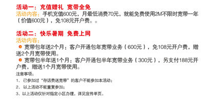 即日起至2009年8月31日,蘇州移動(dòng)客戶只要到蘇州各移動(dòng)營(yíng)業(yè)廳,充值600元手機(jī)話費(fèi),并承諾月最低消費(fèi)70元,就能免費(fèi)使用2M不限時(shí)寬帶一年,光纖接入,不需捆綁固定電話,并可免去108元開戶費(fèi)。