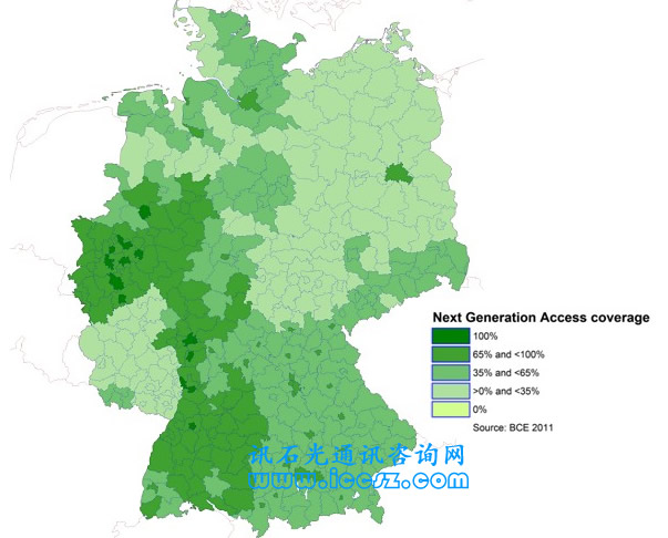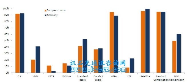 《2011歐洲寬帶覆蓋》調(diào)研報(bào)告顯示,95%的德國(guó)家庭能夠獲得至少1Mbps數(shù)據(jù)的寬帶,只要他們?cè)敢?。這比DG Connect制定的一般標(biāo)準(zhǔn)更高,一般標(biāo)準(zhǔn)是基本寬帶提供的服務(wù)是至少達(dá)到144kbps。接近有61%的德國(guó)家庭能夠使用超高速寬帶(也稱為NGA,即下一代接入)。在調(diào)研的29個(gè)國(guó)家中(歐盟27國(guó)和挪威、冰島),96%能夠獲得基本寬帶,超過(guò)50%(一半國(guó)家走向2020數(shù)字天堂目標(biāo))能夠獲得超高速。