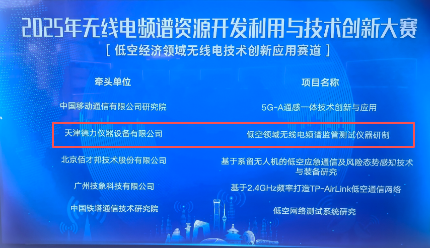 ICC訊 在近日落幕的2025年無線電頻譜資源開發(fā)利用與技術(shù)創(chuàng)新大賽上,一場(chǎng)關(guān)乎低空經(jīng)濟(jì)未來的技術(shù)革新引發(fā)行業(yè)高度關(guān)注——天津德力儀器設(shè)備有限公司憑借"低空領(lǐng)域無線電頻譜監(jiān)管測(cè)試儀器研制"項(xiàng)目,憑借其突出的技術(shù)創(chuàng)新性與實(shí)用價(jià)值,從眾多頂尖項(xiàng)目中脫穎而出,一舉摘得大賽優(yōu)勝獎(jiǎng)!這一里程碑式成果,標(biāo)志著我國(guó)在低空通信安全領(lǐng)域?qū)崿F(xiàn)重大技術(shù)突破。