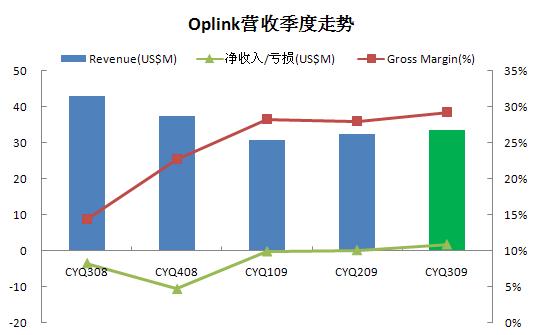 對(duì)于截止于2009年9月30日的2010財(cái)年第一季度,公司此前預(yù)計(jì)銷售收入將在3000萬(wàn)美元到3400萬(wàn)美元之間,實(shí)際銷售收入處于預(yù)計(jì)的上限。自財(cái)報(bào)公布后,Oplink股價(jià)一路上揚(yáng),從14.5美元一直漲到16美元以上??梢?jiàn),公眾對(duì)Oplink財(cái)報(bào)表現(xiàn)持肯定態(tài)度。與Finisar、JDSU、MRV幾大器件廠商相比,雖然Oplink規(guī)模最小,但市值卻超過(guò)MRV直逼Finisar。我們有理由相信,Oplink將憑借有效的成本控制和擴(kuò)大研發(fā)投入不斷提升,占據(jù)更多的市場(chǎng)份額。