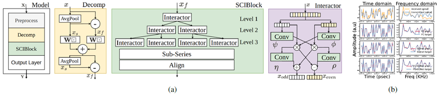 圖1. (a) 展示了創(chuàng)新的FC-SCINet均衡器的框圖。(b) 顯示了50個傳輸(目標(biāo))/接收連續(xù)樣本的時間/頻率域表示,分別顯示了FC和SCInet的影響。