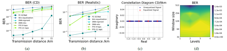 圖2. (a),(b) 展示了FC-SCInet、DNN、FFE和無均衡的情況下的誤碼率與距離的關(guān)系,分別針對Case 1-2(CD-Realistic)。(c) 展示了Case 1(CD)在9 km處的接收星座圖。(d) 展示了Case 1(CD)在9 km處的FC-SCInet窗口大小和互動器級別的誤碼率顏色圖。