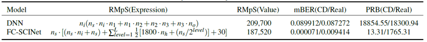 FC-SCINet的復(fù)雜性與最佳3層DNN [60,64,18個神經(jīng)元]之間進(jìn)行了比較,使用的度量標(biāo)準(zhǔn)是每個符號的實(shí)際乘法次數(shù)(RMpS)[6]。通過RMpS與中位誤碼率(mBER)的乘積來表征誤碼率和復(fù)雜性之間的權(quán)衡,稱為PRB。表1提供了RMpS、PRB及其實(shí)例的分析表達(dá)式。從RMpS值來看,F(xiàn)C-SCINet相比所采用的DNN可減少10.577%的復(fù)雜性。