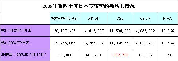 2009年3月18日,根據(jù)日本總務(wù)省最新公布的數(shù)據(jù)顯示,截止2008年12月末,日本寬帶契約數(shù)達(dá)到3011萬,首次超過3000萬;其中FTTH契約數(shù)達(dá)到1442萬,連續(xù)三個(gè)季度超過了DSL契約數(shù)。