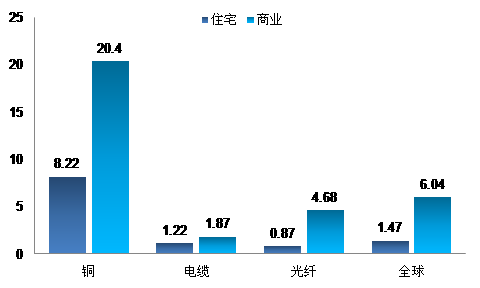 在住宅市場,銅的服務(wù)提供的性價比最低。對于所有用戶來說商業(yè)用戶支付的錢比住宅用戶多得多,這反映了較高的使用率和平均帶寬,企業(yè)所需求的服務(wù)比一般用戶要多。