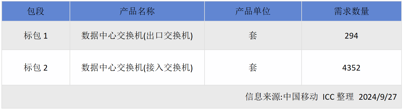 ICC訊 日前,中國移動于官網(wǎng)發(fā)布公告,稱2024至2025年集中網(wǎng)絡云資源池六期工程數(shù)據(jù)中心交換機采購項目資金已落實,項目己具備招標條件,現(xiàn)進行公開招標。招標編號:CMCC20240500240