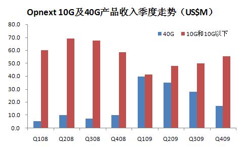 Opnext公司本季度營業(yè)收入減少490萬美元至7610萬美元,環(huán)比下降6.1%。其中10G及以下產(chǎn)品銷售收入增加了520萬美元至5510萬美元,環(huán)比增長10.4%;10G產(chǎn)品營收增長12.6%,增長主要來自XFP和10G數(shù)據(jù)產(chǎn)品;40G及以上產(chǎn)品銷售收入下降1120萬美元至1680萬美元,環(huán)比下降40.1%;工業(yè)和商業(yè)產(chǎn)品銷售收入增長110萬美元至420萬美元,環(huán)比增長35.5%。40G及以上產(chǎn)品銷售收入的下降主要受40G子系統(tǒng)銷售額下滑影響。