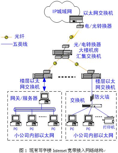 在圖1典型寫字樓Internet寬帶接入網(wǎng)絡結(jié)構(gòu)中,由于受銅質(zhì)5類線傳輸距離小于100米的限制,存在大量的接入交換機和光電轉(zhuǎn)換器,它們被放置在多塵灰、散熱條件差的樓層配線間的掛壁式機柜內(nèi),致使交換機和光電轉(zhuǎn)換器極易出現(xiàn)故障甚至損壞,如死機、過熱、塵埃大量堆積、接插口污染或氧化等故障;其次,由于有源節(jié)點過多,網(wǎng)絡維護管理成本非常高;再次,因樓層接入交換機一般網(wǎng)管功能相對簡單,網(wǎng)絡的安全性、可管理性較差,對用戶的權(quán)限管理非常吃力。