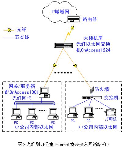 圖2是基于首邁通信OnAccess系列產(chǎn)品設計的寫字樓光纖到辦公室(Fiber To The Office——FTTO)Internet寬帶接入解決方案。網(wǎng)絡核心是首邁通信OnAccess1224光纖以太網(wǎng)交換機,該交換機可以配置2個千兆上聯(lián)光端口,其中一個千兆端口可以用以上聯(lián)電信運營商IP城域網(wǎng),另一個千兆端口可以用于級連其它交換機,該交換機還同時配備了24個100M下聯(lián)光纖端口用以下聯(lián)各小公司內(nèi)部服務器,該服務器內(nèi)插PCI總線OnAccess1001光纖以太網(wǎng)卡即可,傳輸媒介可以選擇多模光纖或單模光纖。
