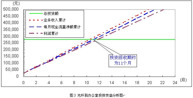 每月業(yè)務收入為24,000元;每月現(xiàn)金凈流入為22,751元;每月利潤為21,459元;投資回收期約只有11個月,如圖3所示。如果能提高接入率,將顯著縮短投資回收器,如接入率提高到80%時,回收期縮短為半年。