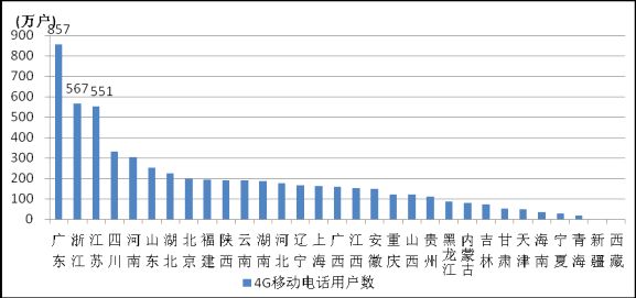 10月,東、中、西部地區(qū)4G移動(dòng)電話用戶分別達(dá)到3202.7、12978、1276.3萬戶,其中超過50%的4G用戶集中在東部地區(qū),用戶占比達(dá)到55.4%。4G移動(dòng)電話用戶各省發(fā)展速度差異明顯,全國4G用戶數(shù)排名前三位的是廣東、浙江和江蘇,用戶數(shù)均超過500萬,分別達(dá)到856.7萬戶、567萬戶和551.1萬戶。用戶數(shù)超過100萬的省份超過三分之二,新疆和西藏地區(qū)成為全國唯一沒有4G用戶的省份。