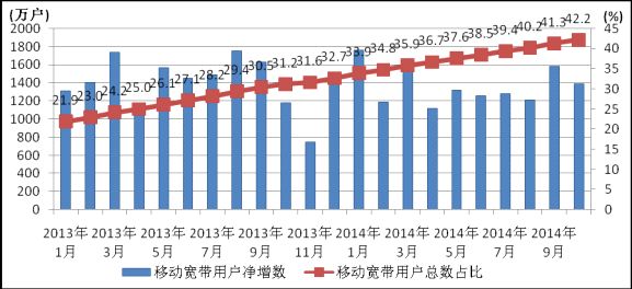 圖2.2013-2014年移動(dòng)寬帶用戶當(dāng)月凈增數(shù)和總數(shù)占比情況