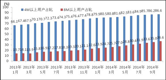 圖3 2013-2014年10月互聯(lián)網(wǎng)寬帶接入速率4M和8M以上用戶占比情況