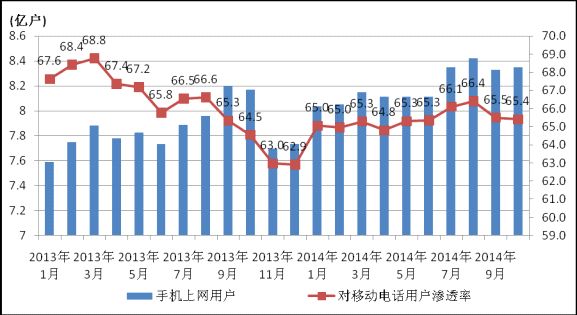 圖4 2013-2014年手機(jī)上網(wǎng)用戶和對(duì)移動(dòng)電話用戶滲透率情況