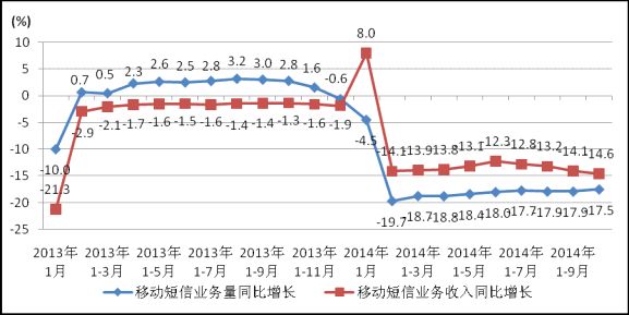 圖6. 2013-2014年各月移動(dòng)短信業(yè)務(wù)量和移動(dòng)短信收入同比增長情況