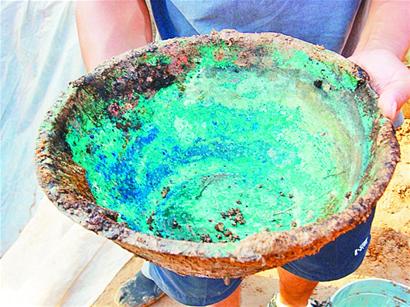 一鏟、一鏟,經(jīng)過考古人員細(xì)心挖掘,一個(gè)青銅質(zhì)地的臉盆出現(xiàn)在人們的視線中。令考古人員吃驚的是,這個(gè)直徑20厘米的青銅盆居然是一個(gè)彩繪青銅器皿。經(jīng)過考古人員的初步清理,記者看到,青銅彩繪器皿中,有一條青龍繪畫在盆壁上,龍的身形好似正在騰飛,龍頭和龍須線條分明。
