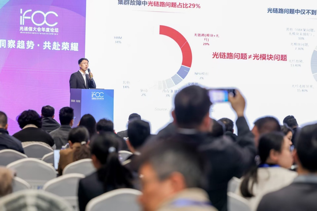 ICC訊 2026年1月16日,IFOC訊石光通信大會(huì)·年度論壇于東莞松山湖舉行。海思光電資深產(chǎn)品應(yīng)用總監(jiān)齊鳴發(fā)表了題為《AI智算大規(guī)模光互聯(lián)的挑戰(zhàn)和解決方案》的主題報(bào)告。報(bào)告指出,隨著AI應(yīng)用升級(jí),算力形態(tài)正向大規(guī)模集群演進(jìn),大規(guī)模光互聯(lián)中光鏈路故障與閃斷已成為引發(fā)智算訓(xùn)練中斷的核心癥結(jié)。海思光電打造星云智檢StarSensor方案,對(duì)光鏈路的故障支持分鐘級(jí)檢測(cè)、厘米級(jí)定位等特性,顯著提升智算網(wǎng)絡(luò)的長(zhǎng)期運(yùn)營(yíng)的可靠性。