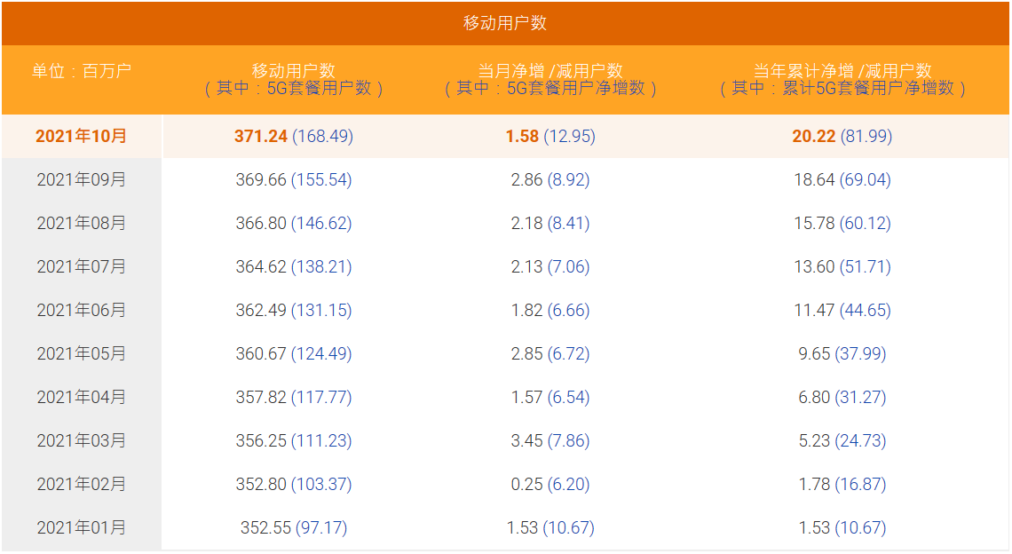 ICC訊 中國電信公布了2021年10月主要運營數(shù)據(jù)。當(dāng)月,中國電信移動用戶數(shù)凈增158萬戶,移動用戶數(shù)累計3.7124億戶。當(dāng)月5G套餐用戶凈增1295萬戶,5G套餐用戶數(shù)累計1.6849億戶。
