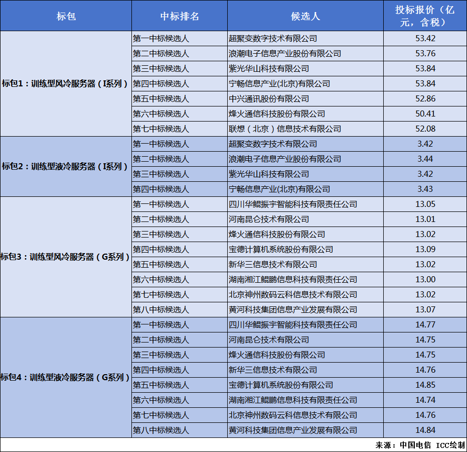 ICC訊 近日,中國(guó)電信AI算力服務(wù)器(2023-2024年)集中采購(gòu)項(xiàng)目(項(xiàng)目編號(hào):ZJZB-2023-17733)評(píng)標(biāo)委員會(huì)按照招標(biāo)文件載明的評(píng)標(biāo)方件的評(píng)審?fù)瓿?。本次集采共分?個(gè)標(biāo)包,包含:訓(xùn)練型風(fēng)冷服務(wù)器(I系列)、訓(xùn)練型液冷服務(wù)器(I系列)、訓(xùn)練型風(fēng)冷服務(wù)器(G系列)、訓(xùn)練型液冷服務(wù)器(G系列),集采金額超80億元,浪潮信息、中興通訊、烽火通信、新華三等多家廠商中標(biāo)。