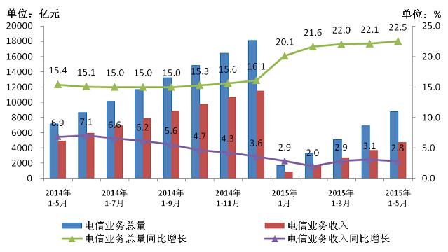 圖1 2014-2015年5月電信業(yè)務(wù)總量與業(yè)務(wù)收入發(fā)展情況