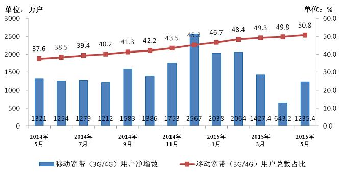 圖2.2014-2015年5月移動寬帶用戶當月凈增數(shù)和總數(shù)占比情況